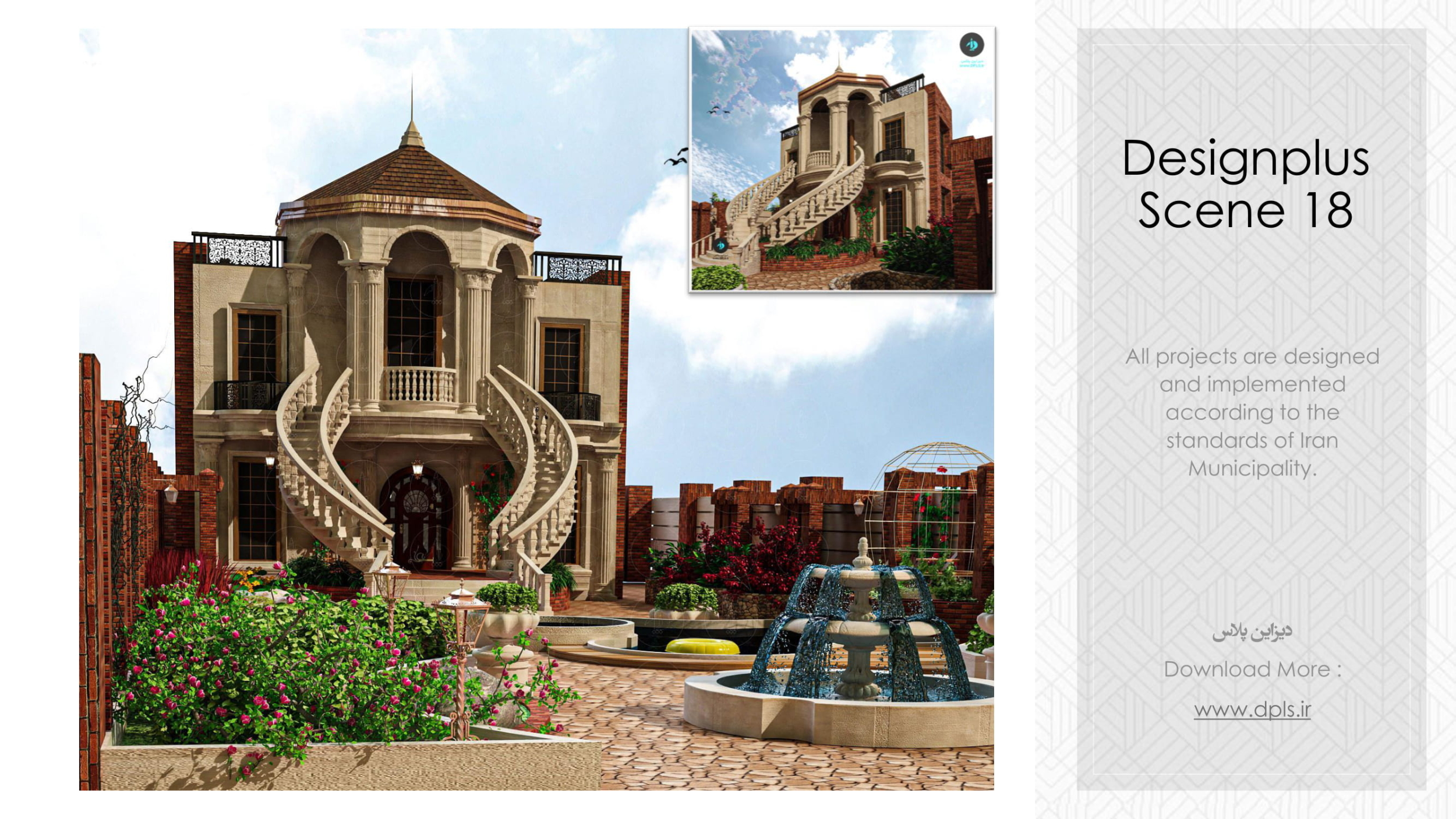 آرشیو دیزاین پلاس سنز مجموعه چهارم ۴ Designplus Scenes شامل ۵ مدل سه بعدی قابل استفاده در ۳Ds Max شامل پروژه های داخلی و خارجی به همراه تمامی نور پردازی ها ، تکسچرها و تنظیمات رندر می باشد که تمامی آنها مورد استفاده در ایران و با تمامی ضوابط طراحی ایران و قوانین شهرداری طراحی شده است و شامل مدل های نهایی ، تایید شده و قابل اجرا می باشد.